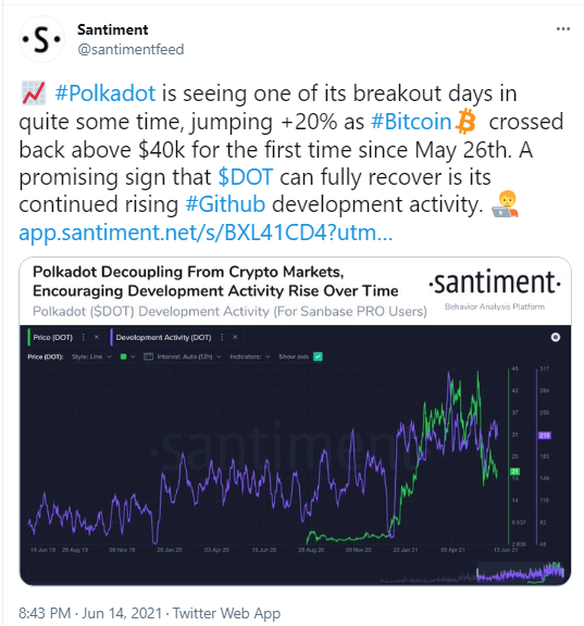 Analysts from Santiment (a crypto market insight firm) opined via Twitter that the Polkadot coin has been on the rise because DOT developers have been active recently. The team has launched several tests, including Parachains on Kusama. Although the Parachains are being launched at a reduced level.