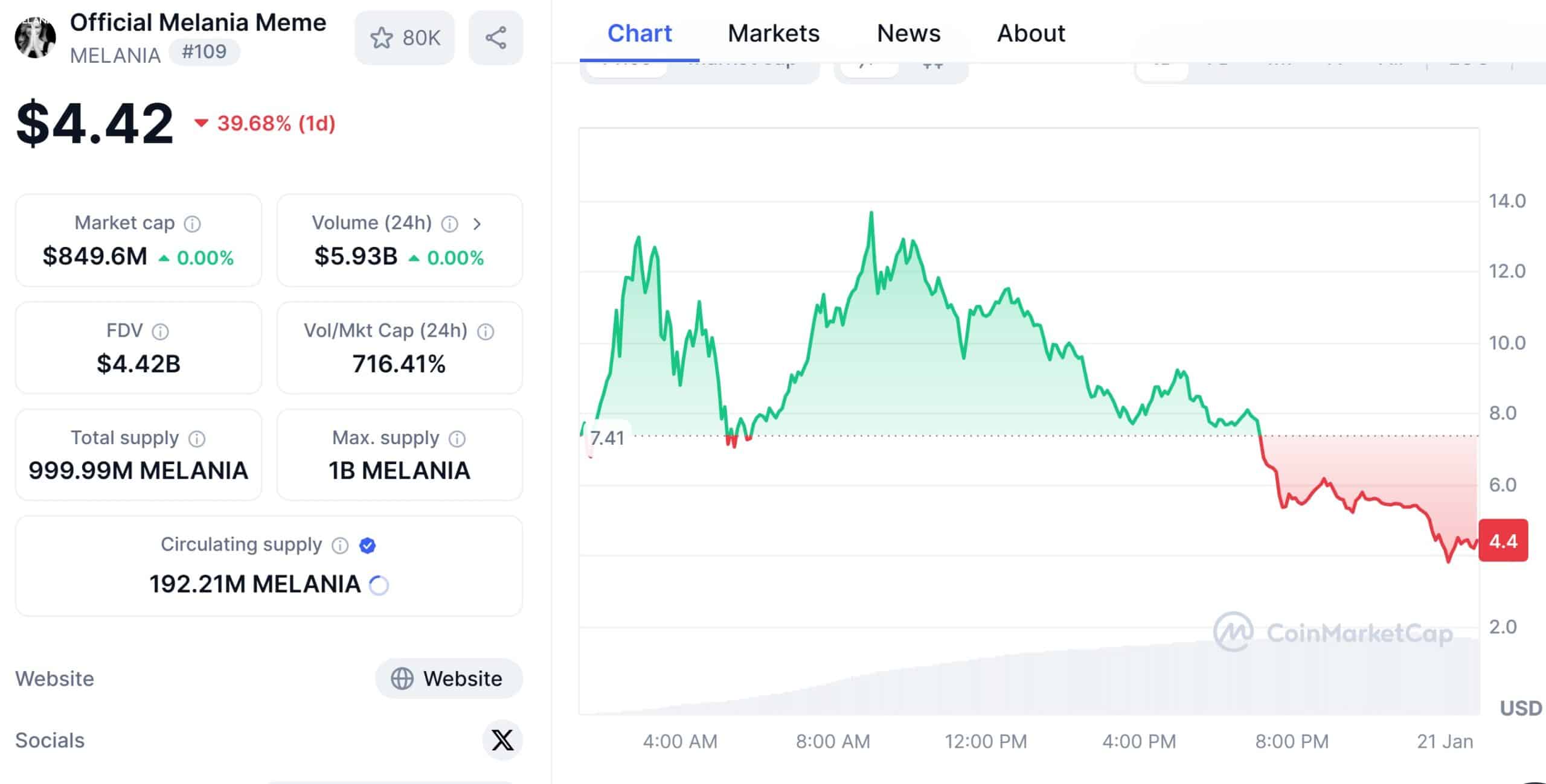 In the past 24 hours the MELANIA Meme coin has risen to over $13 and then crashed back down to $4. This is after the TRUMP Meme coin also soared to over $75 and then crashed down to around $45 the day before. The MELANIA Meme coin is currently available to swap only on the Solana blockchain through Jupiter exchange.